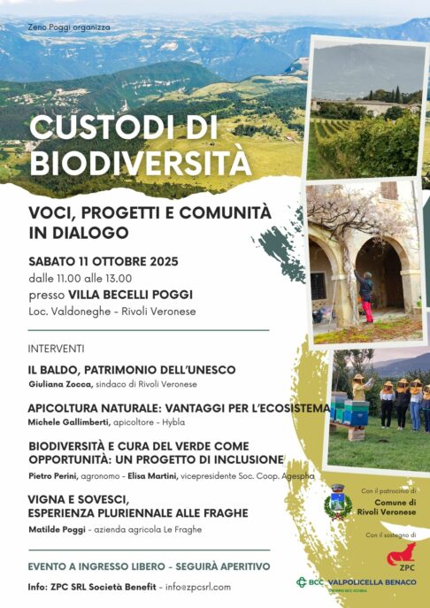Seconda tappa di questo percorso sarà l’evento “Custodi di Biodiversità: voci, progetti e comunità in dialogo”, che si terrà sabato 11 ottobre, dalle 11.00 alle 13.00, presso Villa Becelli-Poggi (Località Valdoneghe di Rivoli Veronese), in uno spazio aziendale che ZPC apre al pubblico per questa speciale occasione, con il patrocinio del Comune di Rivoli Veronese e la sponsorizzazione, oltre che di ZPC, anche di BCC – Banca Valpolicella Benaco.